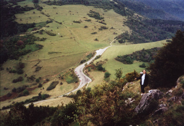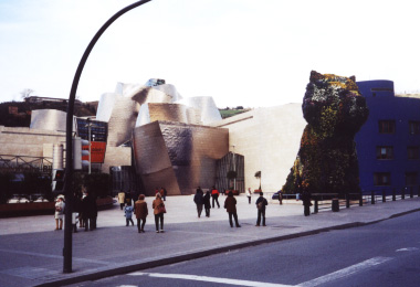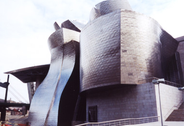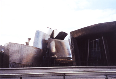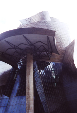 frank o. gehry's guggenheim bilbao. frank o. gehry's guggenheim bilbao. zimmer mit aussicht. blick herab von montsegur. im hintergrund links oben auf dem berg: montsegur.