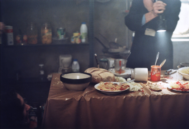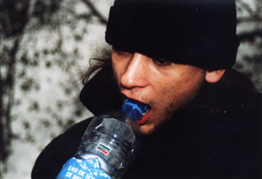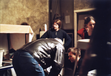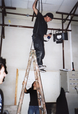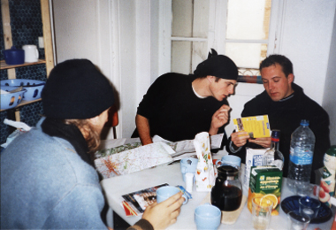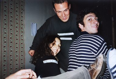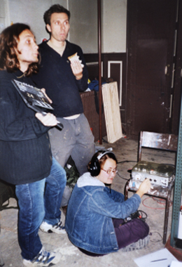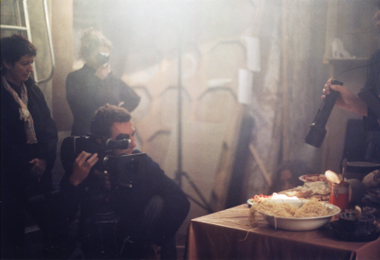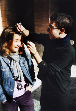 naja, wie gesagt: viele pausen am ersten drehtag... ton - christina; clap - timothée; hunger - emmanuel das ist die kamera, hier zusammen mit anna und jean-philippe erster Drehtag: geprägt von langen pausen am 5.11.2001 erster Drehtag, unser Brad auf dem Tisch am 5.11.2001