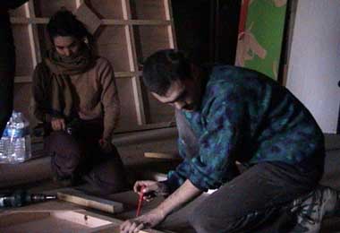 kamel, das marokkanische pendant zu kemal... (aber nur was den namen betrifft). tournage 18.12.01 pinnwände basteln ist leicht, vorausgesetzt, man will sie hinterher nur kurz benutzen. camille. construcion 13.12.01 ein bild aus der phase, wo die wände zum aufstellen vorbereitet wurden. eleonore und jean-francois. construction 13.12.01 Heimfahrt am 12.12.01 - leere Autobahnen Jette und Christina auf einem menschenleeren Rastplatz